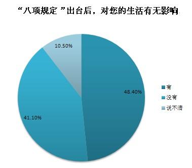 截至2013年12月20日10時,共收到網(wǎng)絡(luò)問卷2442份,48.4%的受訪者認為“八項規(guī)定”對個人生活有影響,其中公務(wù)員群體認為“八項規(guī)定”帶來的最大影響是“公務(wù)吃請少了,能抽出更多時間陪伴家人”和“津貼補貼獎金少了,勒緊褲帶過日子”,非公務(wù)員群體認為“八項規(guī)定”帶來的最大影響是“酒店、高端會所門外的公務(wù)用車少了”和“遇到領(lǐng)導考察工作時,地毯鮮花迎送領(lǐng)導的情況少了”。