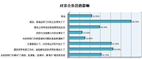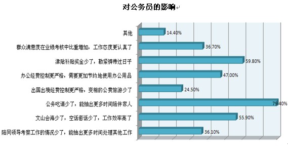 還有三到五成受訪公務(wù)員認為“辦公經(jīng)費控制更嚴格,需要更加節(jié)約地使用辦公用品”、“群眾滿意度在業(yè)績考核中比重增加,工作態(tài)度更認真了”和“陪同領(lǐng)導考察工作的情況少了,能抽出更多時間處理其他工作”是“八項規(guī)定”帶來的幾大影響。