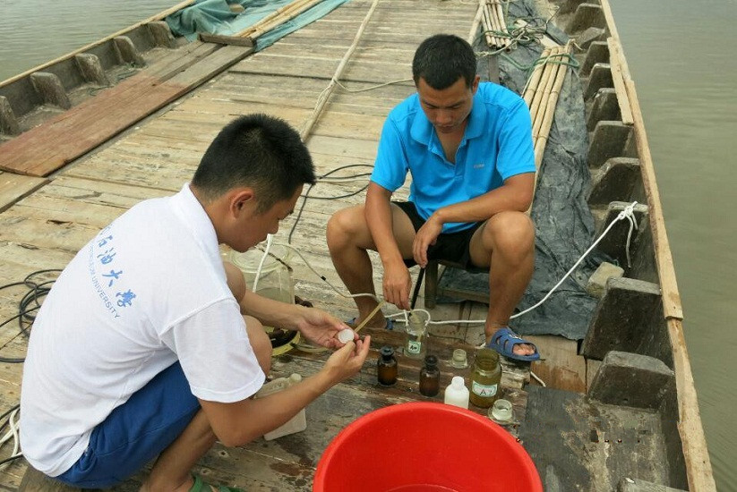 7月10日,團(tuán)隊(duì)聯(lián)合廣西海洋研究所紅樹林研究中心對欽江東西支流進(jìn)行水樣調(diào)查,這是此次活動中的重要工作。6名男生在船上和工作人員一同工作了26個(gè)小時(shí),協(xié)助工作人員進(jìn)行水樣采集與固定,流速與流向測定,水深測定及GPS定位等,從中也學(xué)到了很多海洋知識。