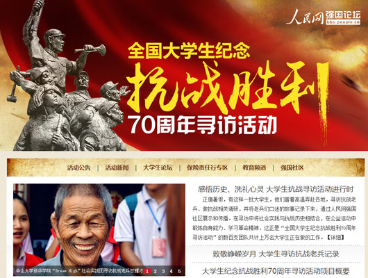 本次活動吸引了來自全國200多所高校的800支大學生團隊報名,大學生們尋訪抗戰(zhàn)老兵,聆聽抗戰(zhàn)故事,重走抗戰(zhàn)遺址,調研人文歷史,感悟革命精神。各團隊實踐期間在人民網強國社區(qū)大學生論壇實時播報實踐進程,發(fā)回稿件數(shù)千篇。浙江大學一位學生在實踐總結中說:“我們的活動通過人民網的平臺得到了更多媒體的關注,讓更多的人關注到關愛抗戰(zhàn)老兵行動,這個暑假沒有白過,真的很有意義!”