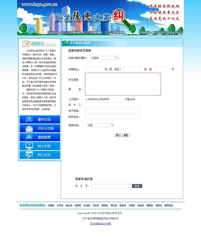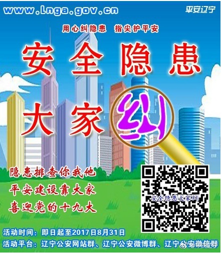 為深入貫徹落實習(xí)近平總書記系列重要講話精神,充分發(fā)揮全省“網(wǎng)上公安機(jī)關(guān)”平臺作用,遼寧省公安廳從即日起至8月31日,組織全省公安機(jī)關(guān)依托各級公安政務(wù)網(wǎng)站、公安政務(wù)微博、公安政務(wù)微信平臺,集中開展“安全隱患大家糾”活動,全面開啟遼寧公安“查患治患”工作的“互聯(lián)網(wǎng)+”模式。