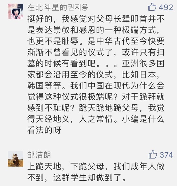 此類“跪拜感恩儀式”此前也多次見諸媒體。有人認為憑借“跪拜父母”這樣一個古樸而鄭重的形式,可以倡導日益淡薄的感恩文化回歸,也有網友認為“孝道在心,不在做秀”,或從人格養(yǎng)成方面評論:“跪拜禮抹殺了獨立人格”。