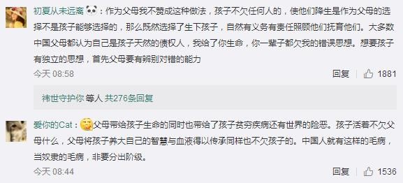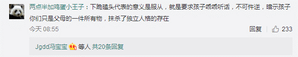 網友“兩點半加雞蛋小王子”:下跪磕頭代表的意義是服從,就是要求孩子乖乖聽話,不可忤逆,暗示孩子你們只是父母的一件所有物,抹殺了獨立人格的存在。