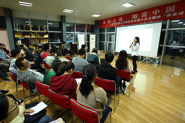 錄制前的電話初采時,聽聞李婧竟是比記者僅大一歲的博士生,我訝異不止。清脆活潑的聲音,大方清晰的談吐,正是一場場宣講留在她身上的印記,也帶著遠遠超出她這個年紀的穩(wěn)重和堅定。從2017年作為第一批宣講人加入西安交通大學學生微宣講團開始,從山村小學到重點高校,從工廠車間到領軍企業(yè),從邊防軍營到繁華都市,李婧的足跡遍布22個。ㄊ小⒆灾螀^(qū)),參與宣講工作。