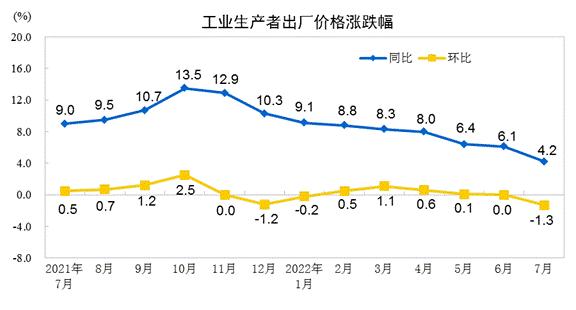 7月份,工業(yè)品價(jià)格整體下行,PPI環(huán)比下降,同比漲幅繼續(xù)回落。