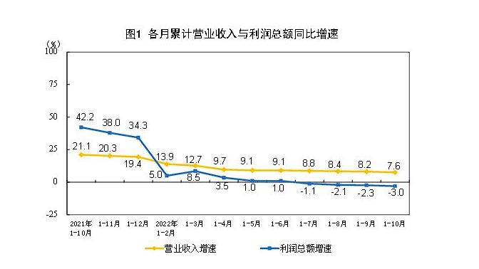 國家統(tǒng)計局數(shù)據(jù)顯示,今年前10個月,全國規(guī)模以上工業(yè)企業(yè)營業(yè)收入同比增長7.6%,利潤同比下降3%。國家統(tǒng)計局工業(yè)司高級統(tǒng)計師朱虹解讀工業(yè)企業(yè)利潤數(shù)據(jù)時表示,總體看,工業(yè)企業(yè)利潤下降,結構繼續(xù)改善,部分中下游行業(yè)利潤回升明顯。但也要看到,近期國內(nèi)疫情散發(fā)多發(fā),世界經(jīng)濟衰退風險加劇,工業(yè)企業(yè)效益恢復面臨較大壓力。