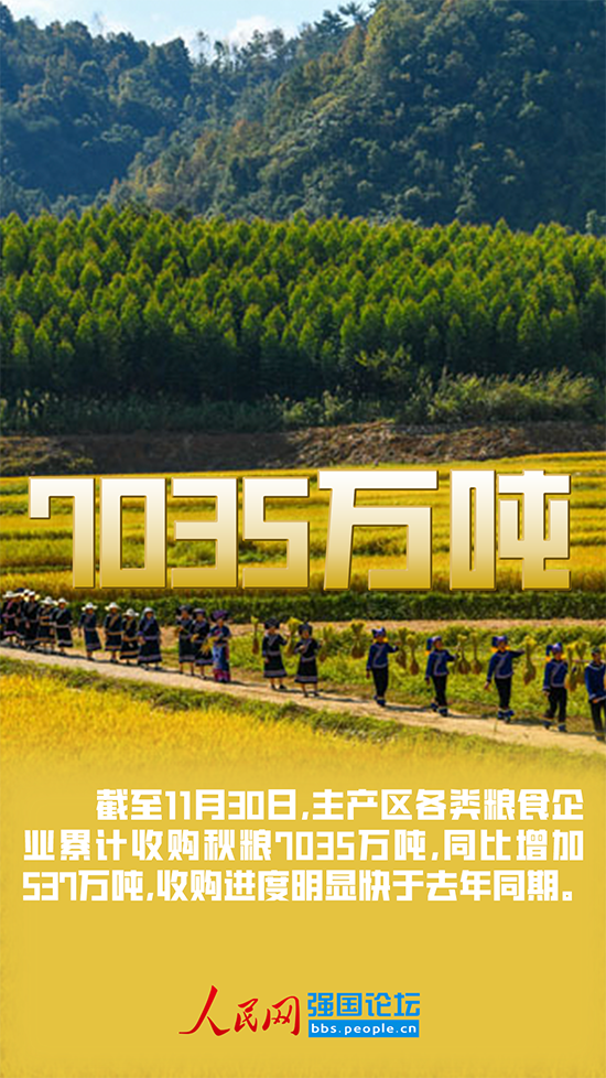 隨著各地大規(guī)模秋收結(jié)束,秋糧開始集中上市交易。據(jù)國家糧食和物資儲備局最新發(fā)布,截至11月30日,主產(chǎn)區(qū)各類糧食企業(yè)累計收購秋糧7035萬噸,同比增加537萬噸,收購進(jìn)度明顯快于去年同期。“相比于2021年、2020年、2019年的6498萬噸、6803萬噸、5614萬噸,與歷年同期相比,今年達(dá)到了近年來糧食企業(yè)秋糧收購數(shù)量的最高值!崩钚潞Uf道。