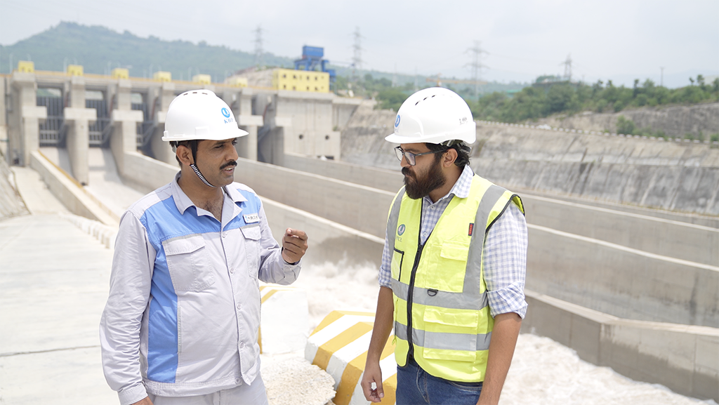 巴方員工在卡洛特水電站壩區(qū)查看水勢(shì)情況。(龍飛攝)